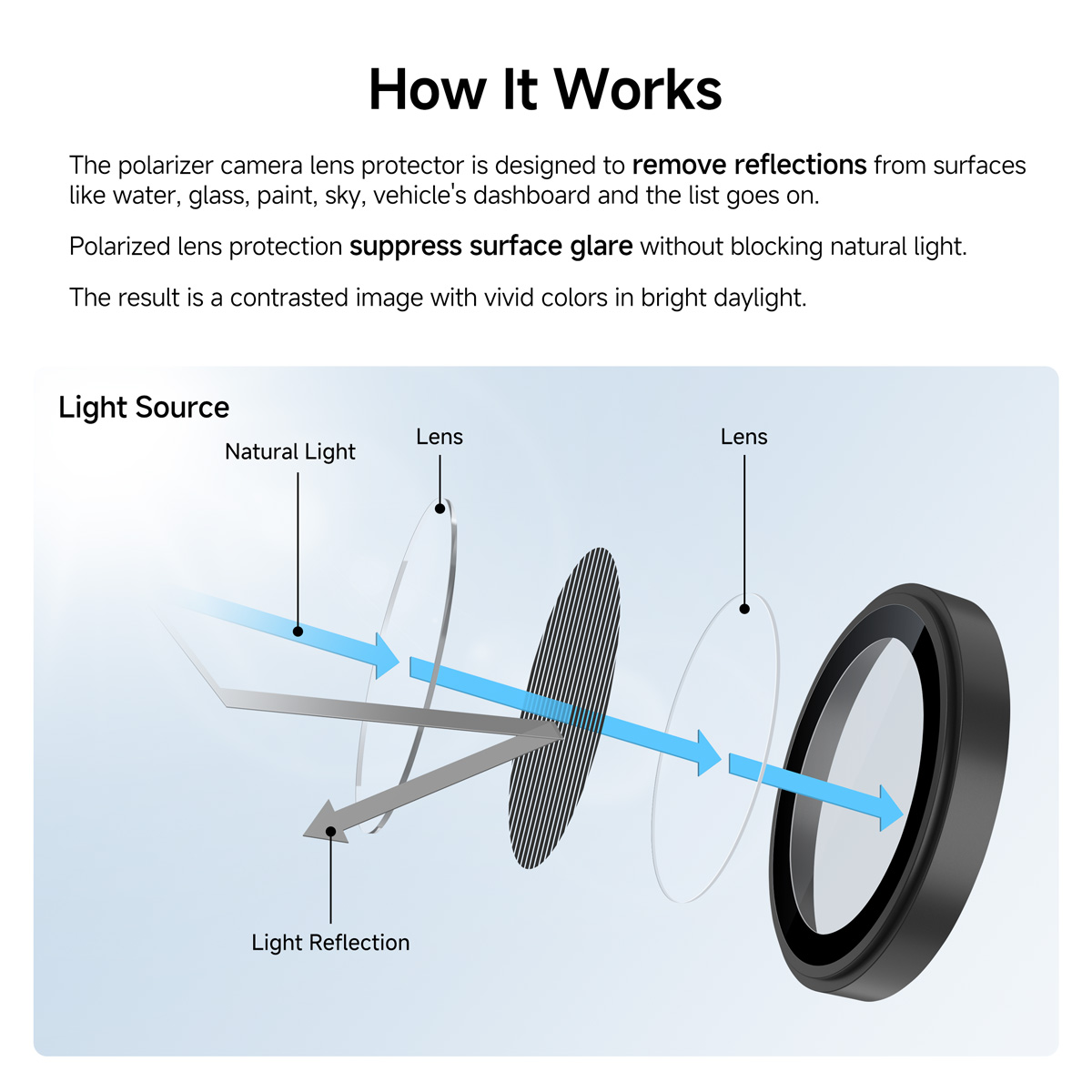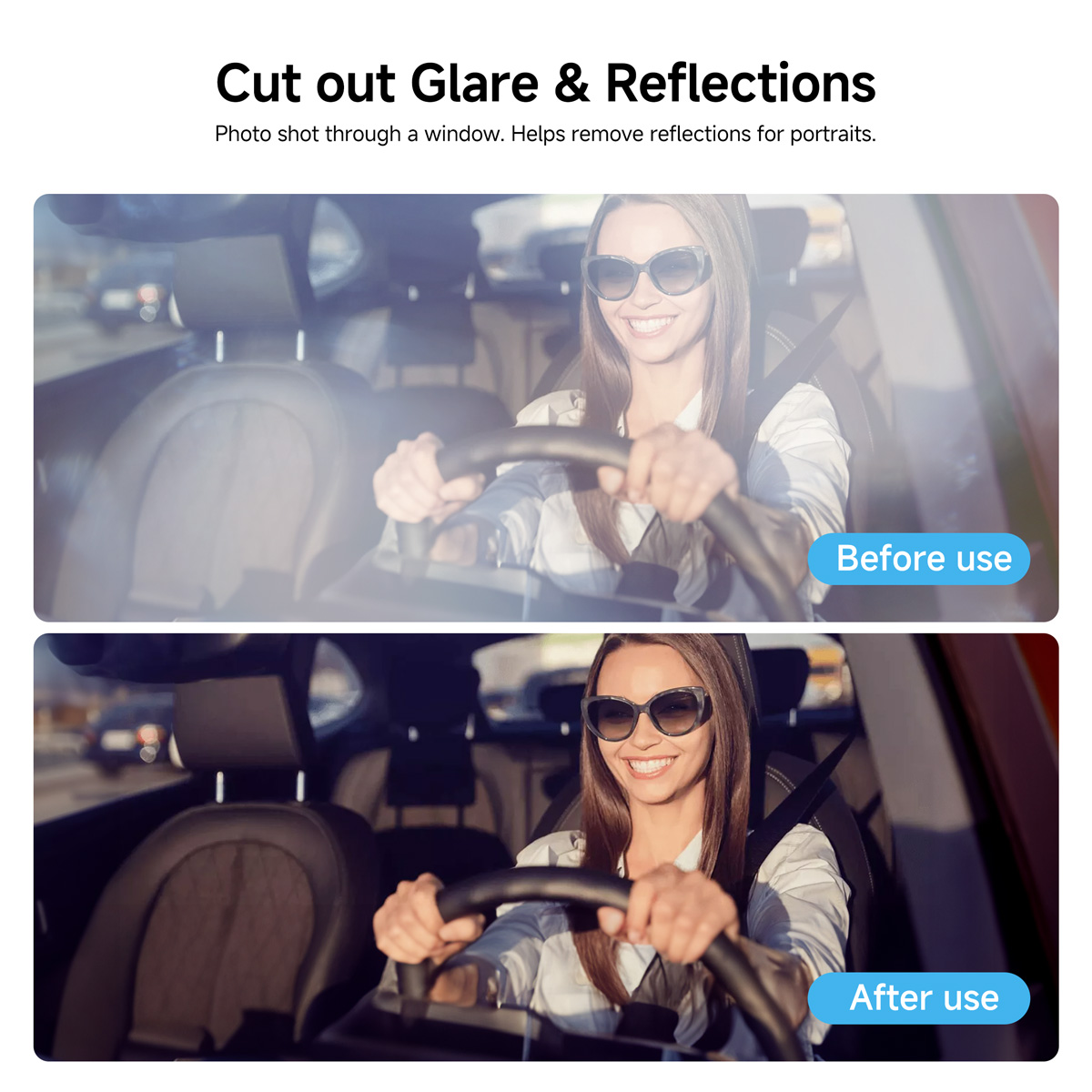 • 减少眩光:减少反射,使照片更清晰 • 增强对比度:提升强光下的图像细节 • 镜头保护:防止刮擦/灰尘