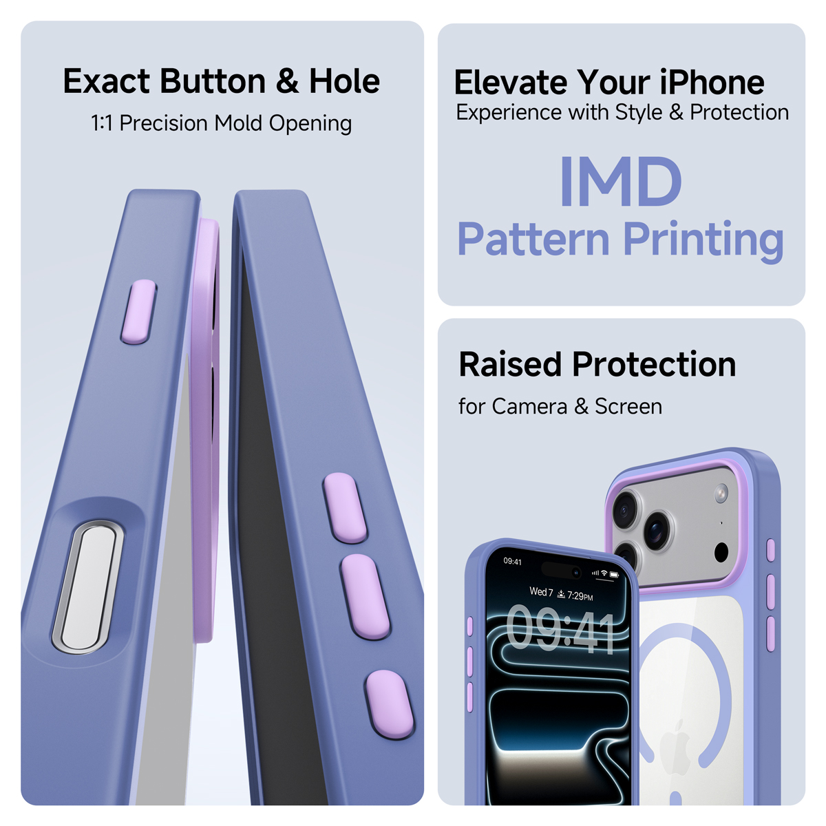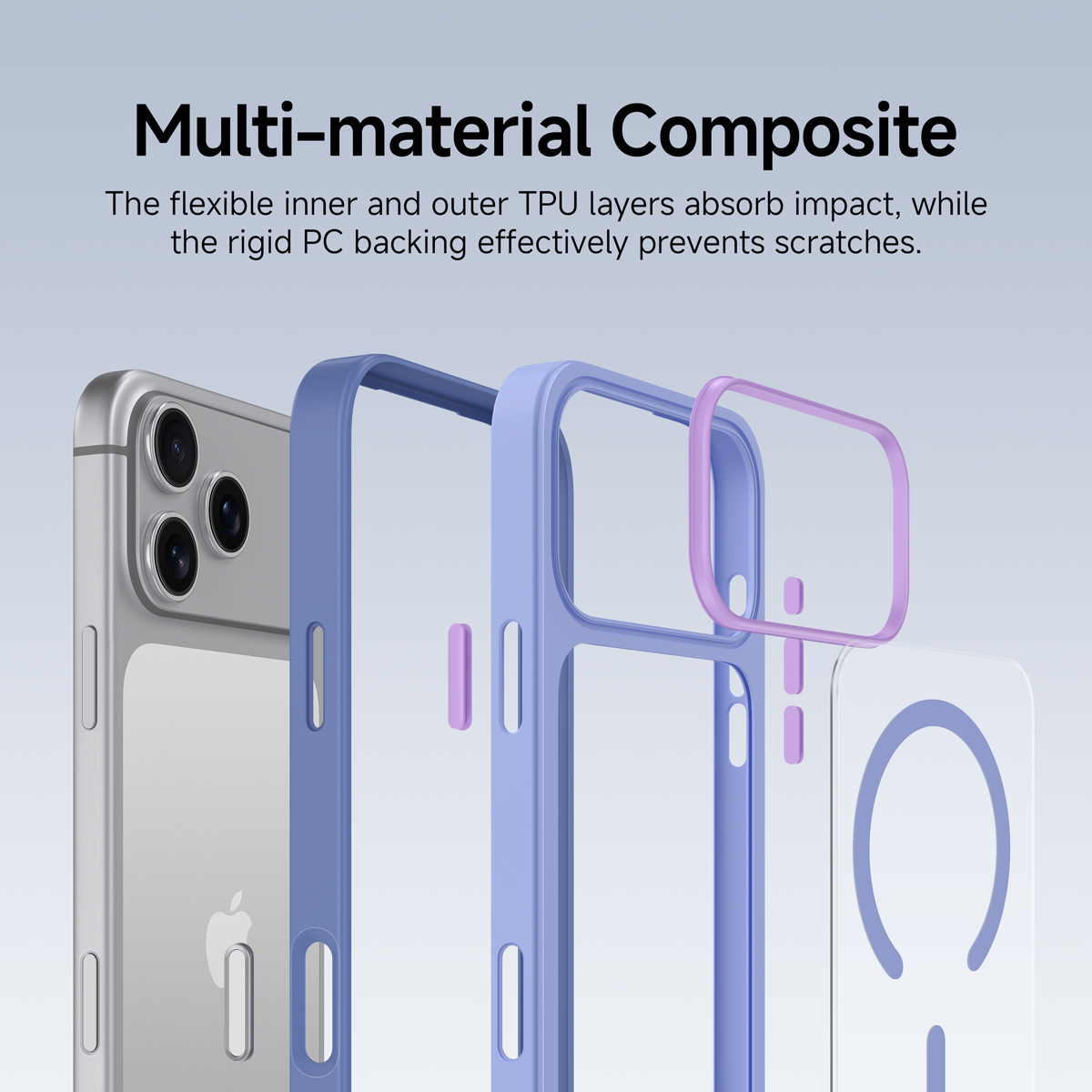 采用双色PC+TPU结构,坚固的PC背板耐刮擦,而柔软的TPU边框可吸收90%的冲击力,有效保护您的iPhone免受日常跌落和碰撞的损害。